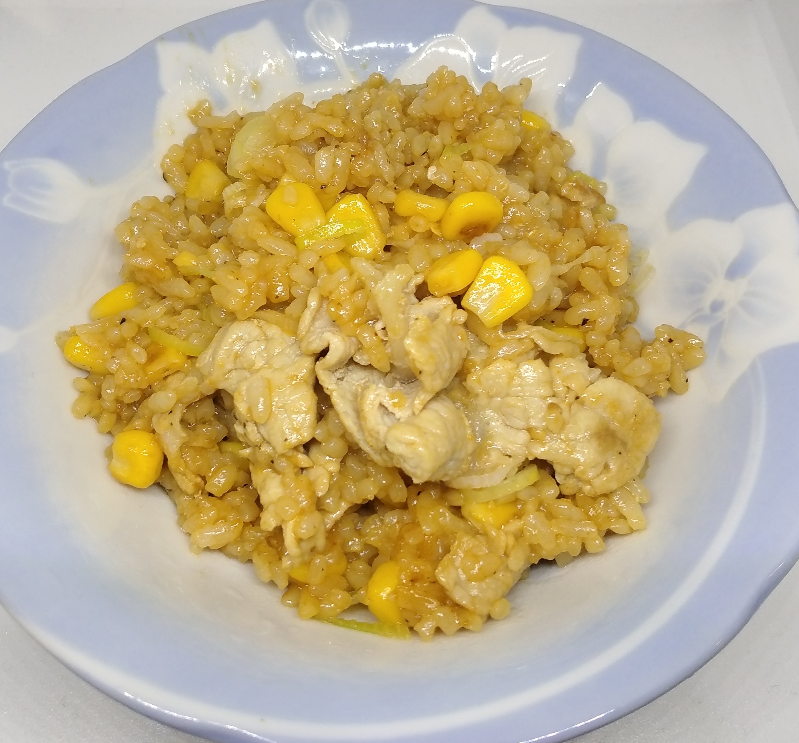ざっくり言うと…ご飯と豚こま肉とコーンを塩コショウ、バター、焼肉のタレで炒めて、ネギを混ぜて仕上げます。