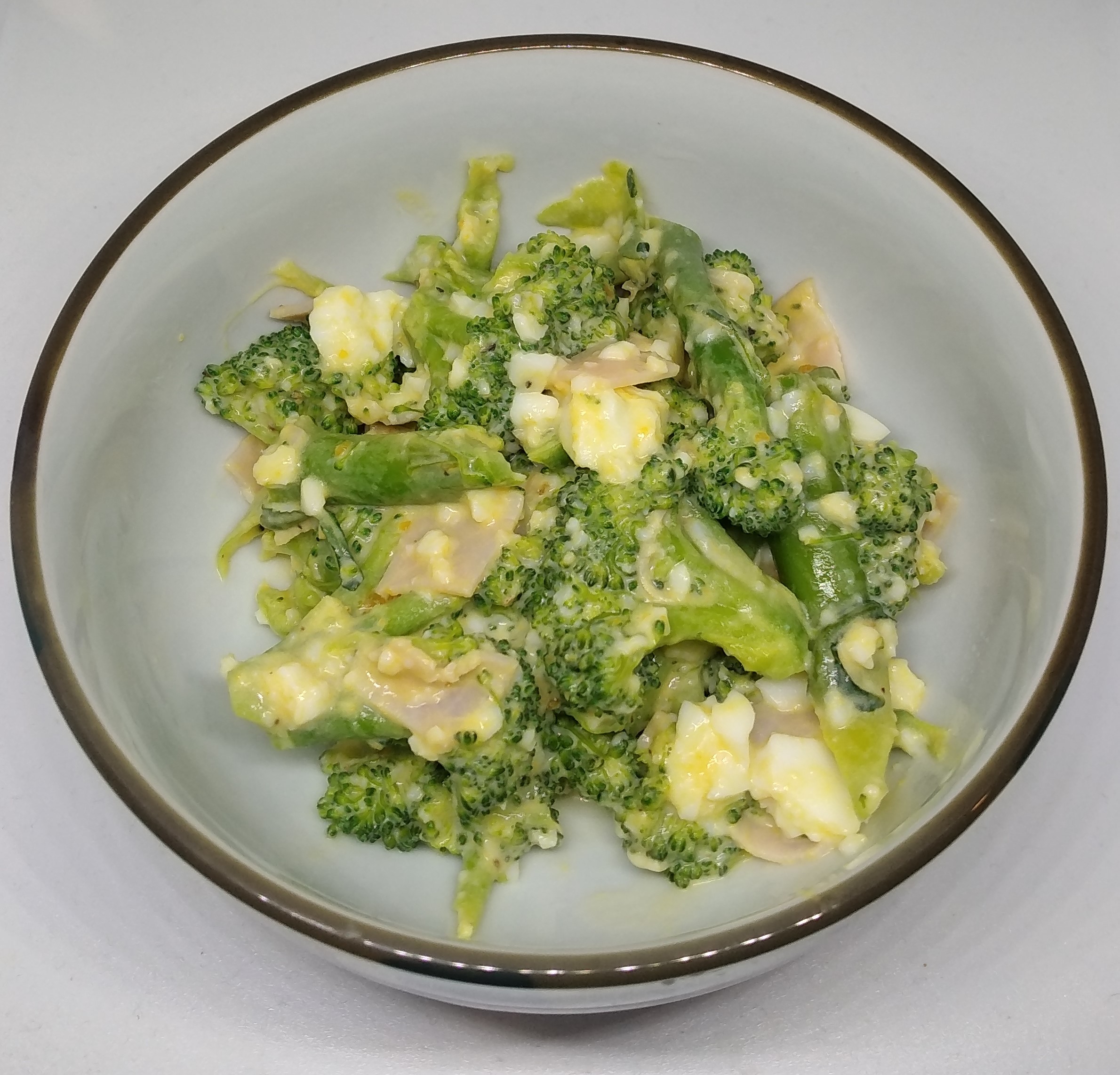 ざっくり言うと…ブロッコリーと卵とハムをマヨネーズで和え、塩と黒胡椒で味を整えます。